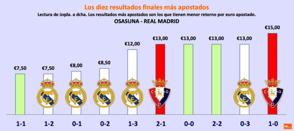 El mercado principal refleja un claro favoritismo hacia el conjunto blanco, justificado por su posición de líder en solitario (con dos puntos de colchón sobre su perseguidor más cercano). Sin embargo, El Sadar impone respeto, y los datos de 888sport así lo demuestran.